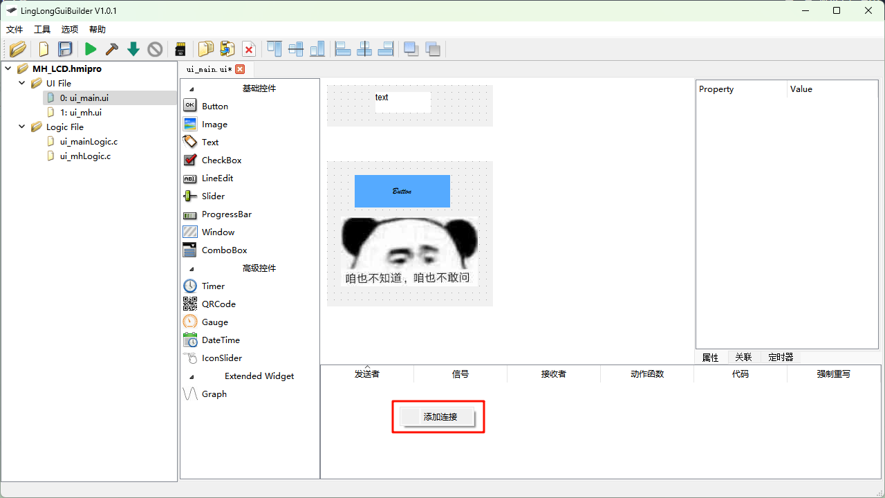 这一页中最关键的部分,就是“连接”的概念;简单理解,它就像是在某个控件的某个动作和你自己写的函数之间架了一座桥;具体来说: