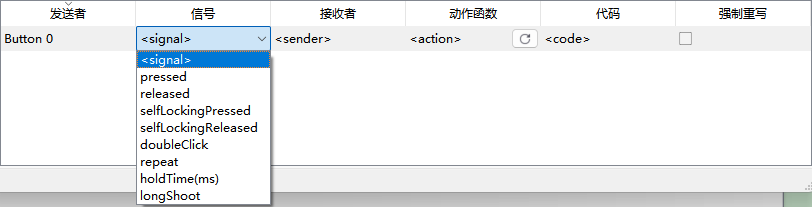 你可以看到,不同的控件支持不同的信号类型(这部分建议大家多点一点,每个控件支持的信号都列得很清楚);比如 Button 支持按下、抬起、自锁状态下的切换等;